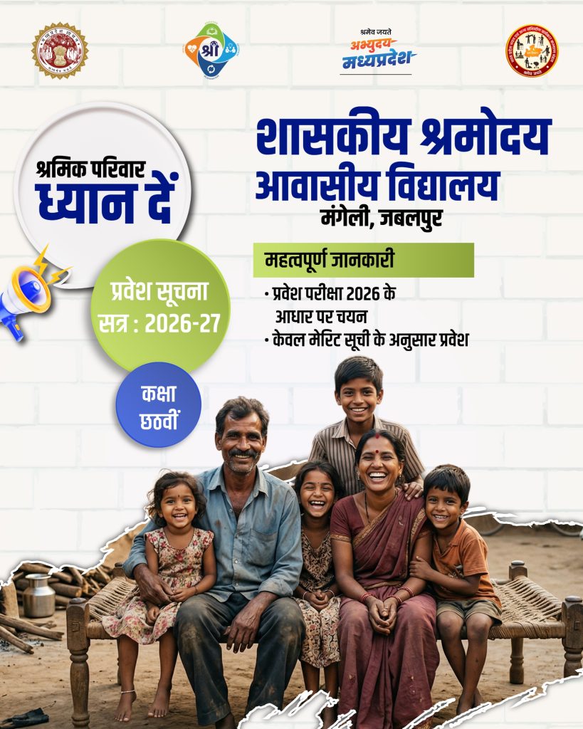 मध्यप्रदेश शासन द्वारा संचालित शासकीय श्रमोदय आवासीय विद्यालय, मंगेली (जबलपुर) में शैक्षणिक सत्र 2026-27 के लिए कक्षा 6वीं में प्रवेश की प्रक्रिया…