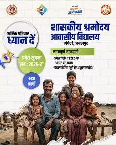 मध्यप्रदेश शासन द्वारा संचालित शासकीय श्रमोदय आवासीय विद्यालय, मंगेली (जबलपुर) में शैक्षणिक सत्र 2026-27 के लिए कक्षा 6वीं में प्रवेश की प्रक्रिया शुरू कर दी गई है। यह अवसर विशेष रूप से श्रमिक परिवारों के बच्चों के लिए है, जिनका चयन प्रवेश परीक्षा 2026 की मेरिट सूची के आधार पर किया जाएगा।