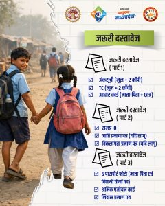 प्रवेश के लिए अभ्यर्थियों को आवश्यक दस्तावेजों के साथ उपस्थित होना अनिवार्य है। इनमें अंकसूची, स्थानांतरण प्रमाण पत्र (TC), आधार कार्ड, समग्र आईडी, जाति एवं विकलांगता प्रमाण पत्र (यदि लागू), पासपोर्ट साइज फोटो, श्रमिक पंजीयन कार्ड, निवास प्रमाण पत्र, आय प्रमाण पत्र, जन्म प्रमाण पत्र एवं मेडिकल प्रमाण पत्र शामिल हैं।
