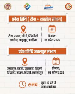 प्रवेश प्रक्रिया को दो चरणों में विभाजित किया गया है। रीवा एवं शहडोल संभाग (रीवा, सतना, सीधी, सिंगरौली, शहडोल, अनूपपुर, उमरिया) के विद्यार्थियों के लिए प्रवेश तिथि 1 अप्रैल 2026 निर्धारित की गई है। वहीं, जबलपुर संभाग (जबलपुर, कटनी, बालाघाट, सिवनी, छिंदवाड़ा, मंडला, डिंडोरी, नरसिंहपुर) के अभ्यर्थियों के लिए 2 अप्रैल 2026 को प्रवेश प्रक्रिया आयोजित की जाएगी। दोनों दिनों में समय सुबह 10 बजे से शाम 4 बजे तक रहेगा।